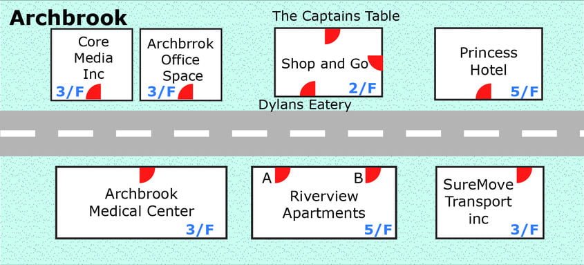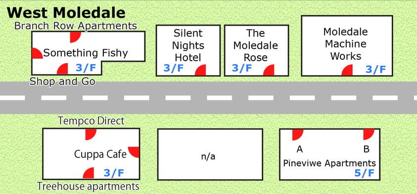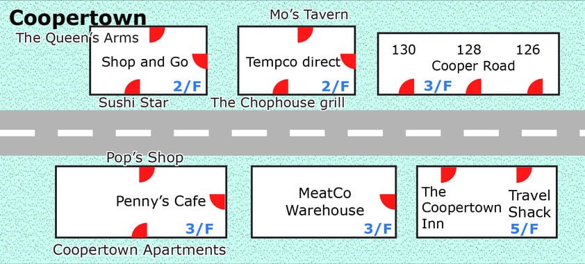 Masing-masing lokasi memiliki susunan, lokasi dan tata letak bangunan yang sama. Namun bagian dalam interor bangunan berubah atau berganti saat reset. Berikut ini lokasi bangunan yang ada di masing-masing kota: