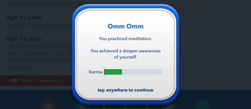 Menikah dengan seseorang yang lebih tua bukan hal yang buruk lho! Memang Happiness anda akan turun drastis namun saat mereka meninggal, anda akan mendapatkan harta warisan! Mungkin terdengar terlalu kejam dan tidak manusiawi namun itulah salah satu cara yang bisa anda lakukan untuk mendapatkan uang banyak di BitLife. Ho ho ho… (Jangan dicontoh di dunia nyata ya!)