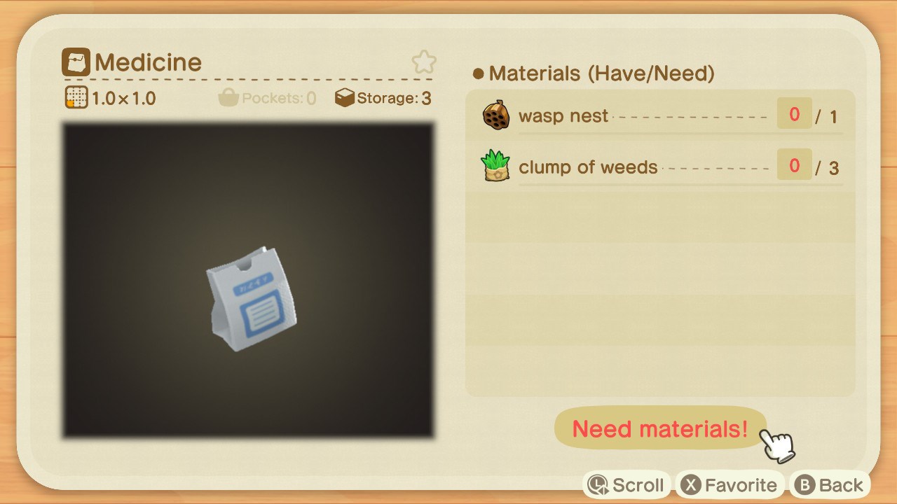 Untuk menyembuhkan luka dari sengatan tawon atau Wasp, anda bisa menggunakan Medicine. Ada beberapa cara untuk memperoleh Medicine, pertama anda bisa membelinya atau kedua anda bisa membuatnya sendiri melalui proses crafting. Jika anda belum memiliki resep DIY Medicine, anda bisa membelinya melalui Tom Nook atau membeli Medicine yang sudah jadi melalui Timmy atau Tommy dengan membayarkan sejumlah Bell.