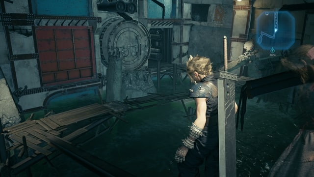 Setelah Aerith membuka jalur baru, lanjutkan perjalanan hingga anda sampai ke tempat dimana Aerith berada. Saksikan cutscene kemudian beloklah ke arah kanan untuk menghancurkan boks Shinra yang ada disana. Cek bagian kiri lalu panjatlah tangga untuk menuju ke area selanjutnya.