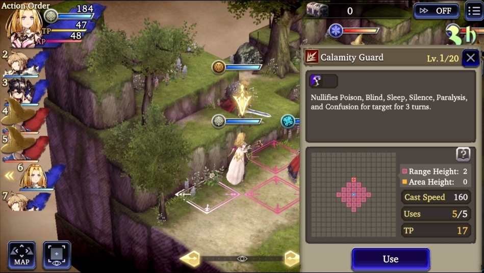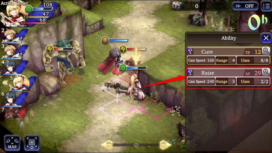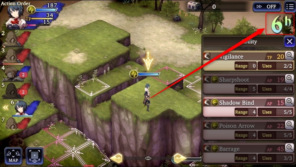 Karakter yang memiliki stat AGI (Agility) yang tinggi akan mendapatkan giliran lebih cepat ketimbang dengan karakter yang memiliki AGI yang rendah. Perlu diketahui juga, karakter yang tidak melakukan aksi apapun seperti menyerang dan atau menggunakan ability setelah dirinya melangkah akan mendapatkan giliran yang lebih cepat juga selanjutnya.